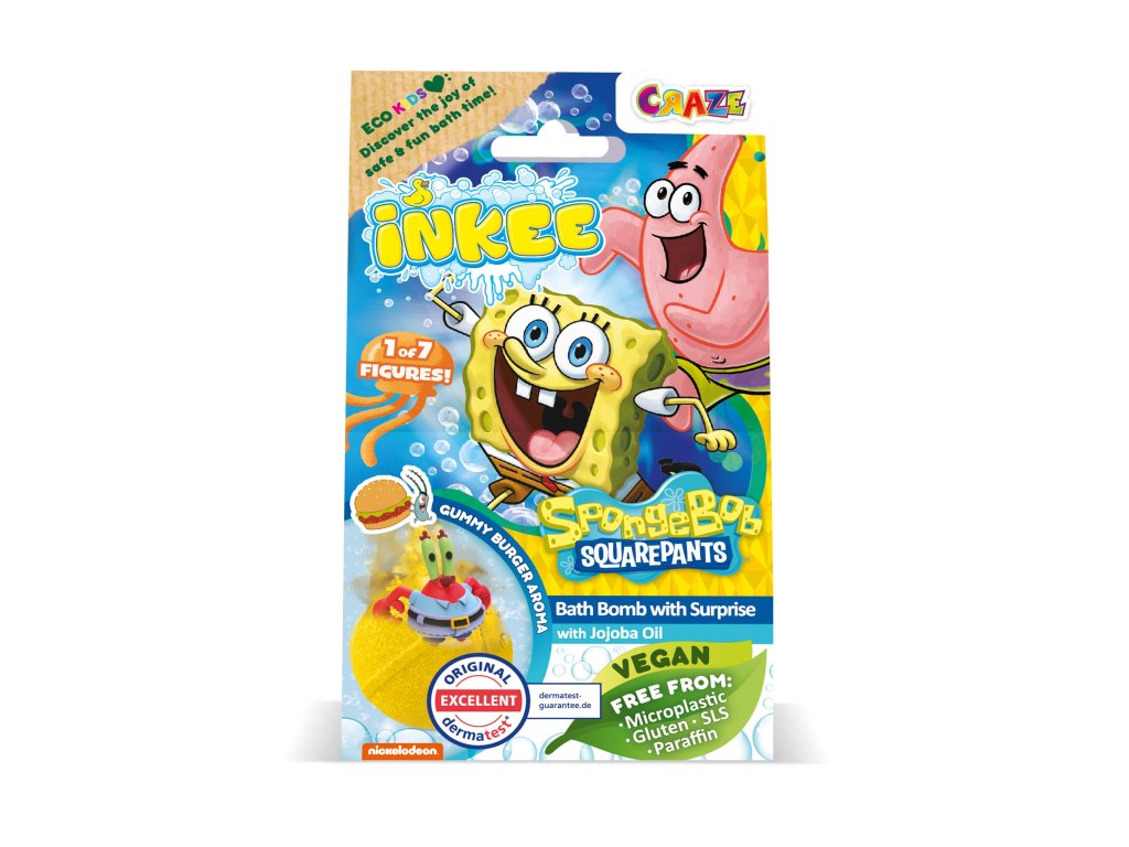 INKEE Surprise Bath Bomb s motivem SpongeBoba nabízí skvělou koupací zábavu pro všechny fanoušky této ikonické postavičky. Po vhození do vody se bomba začne intenzivně rozpouštět, zbarví vodu do zářivě žluté nebo tyrkysové a provoní celou koupelnu vůní gumových burgerů.