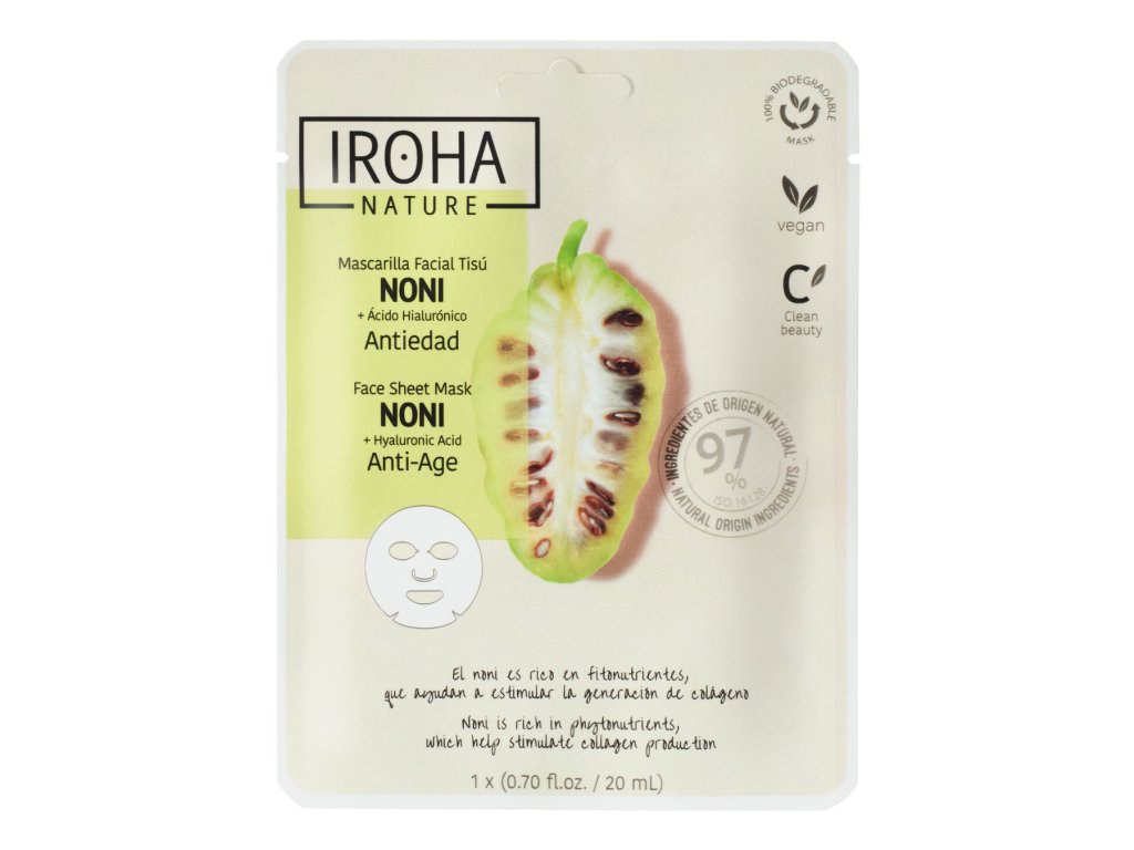 Anti-aging maska Iroha Nature s výtažkem z noni podporuje tvorbu kolagenu, zpevňuje a vyhlazuje pleť. Obsahuje kyselinu hyaluronovou pro okamžitou hydrataci a svěží vzhled.