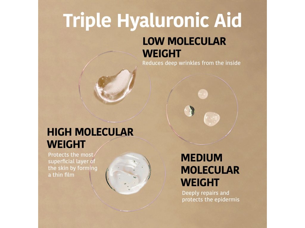 Nízká molekulární hmotnost proniká do hlubších vrstev pro redukci vrásek, střední poskytuje výživnou hydrataci epidermis a vysoká molekula pomáhá utvářet ochrannou vrstvu na povrchu pleti. Iroha Nature