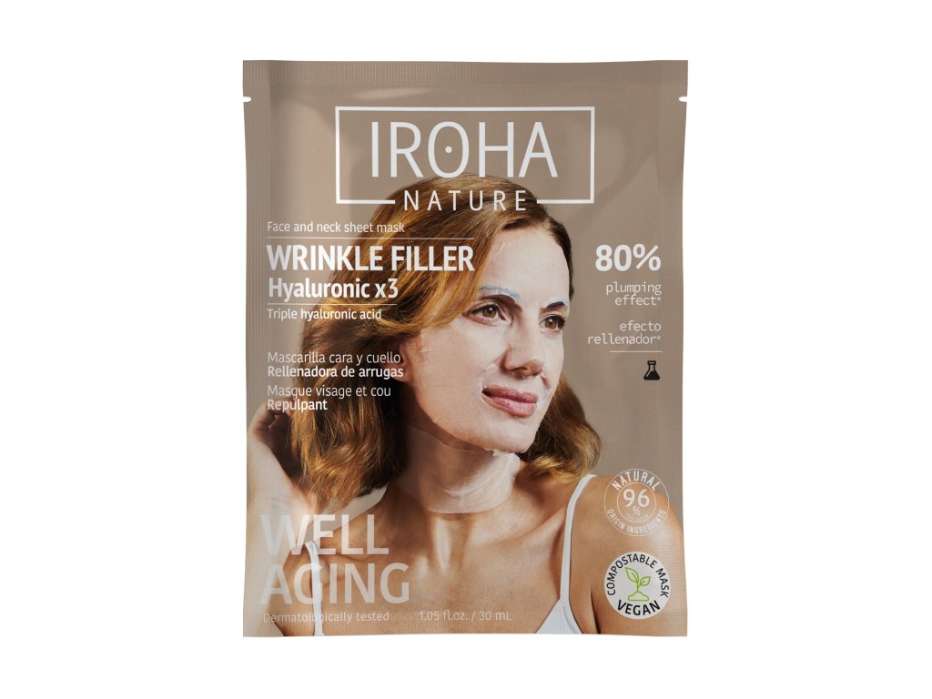 Iroha Nature Triple HA Face & Neck Mask je navržena pro komplexní péči o obličej, krk a dekolt. Obsahuje tři druhy kyseliny hyaluronové s různou velikostí molekul, které působí v různých vrstvách pleti: