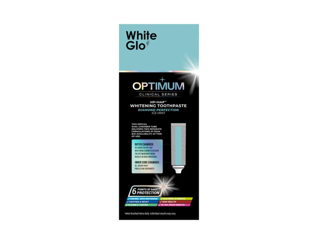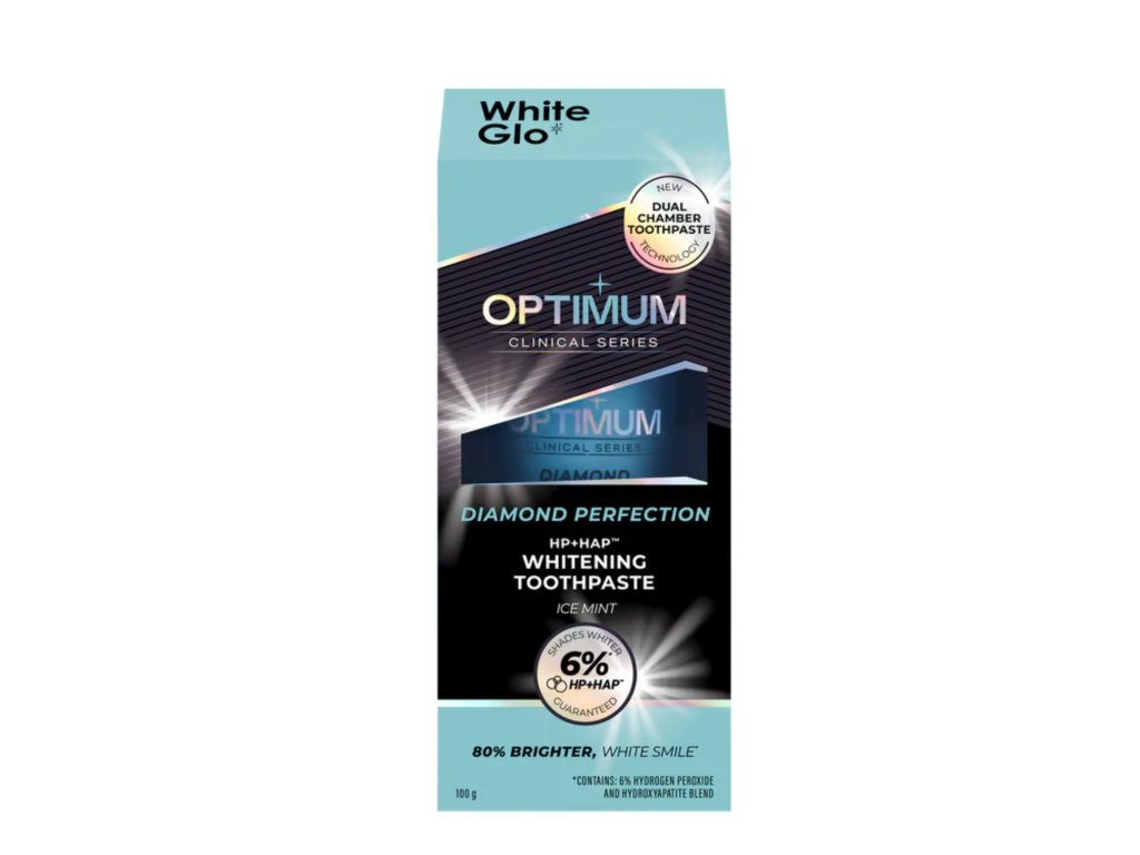 White Glo Optimum Diamond Perfection je pokročilá bělicí zubní pasta s technologií dvou komor, která kombinuje 2 % peroxid vodíku a HAP gel pro profesionální výsledky bělení z pohodlí domova. Obsahuje speciální lesklý vosk pro okamžitě zářivější sklovinu a osvěžující mátovou příchuť. Vyvinuto australskými zubními lékaři pro bezpečné každodenní používání a maximální efekt bělení.