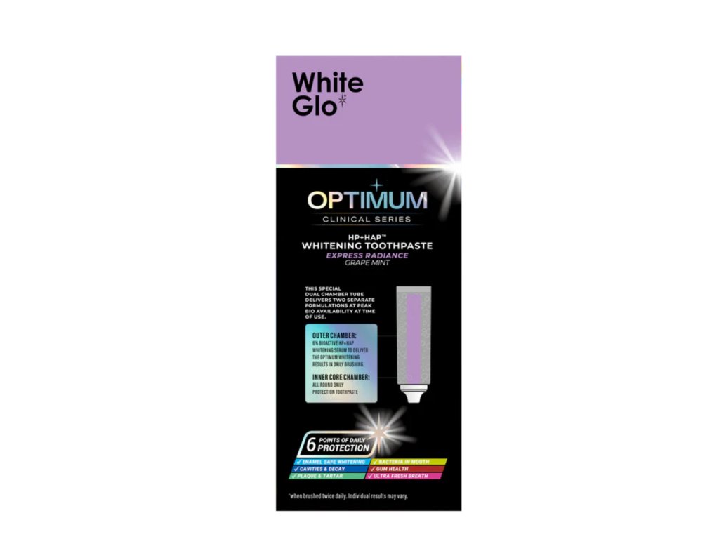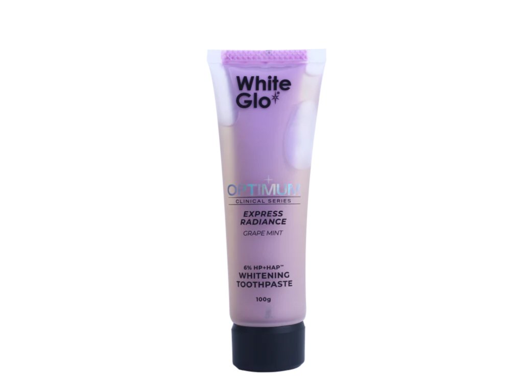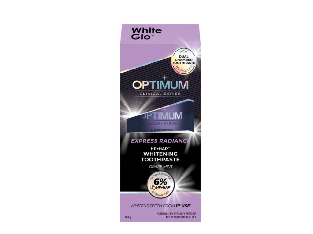 White Glo Optimum Express Radiance zajišťuje bělejší zuby již po prvním čištění díky technologii dvou komor a kombinaci 2 % peroxidu vodíku, HAP gelu a mikročisticích částic. Efektivně odstraňuje skvrny a zanechává dlouhotrvající pocit svěžího dechu s hroznově-mátovou příchutí. Vyvinuto australskými zubními lékaři pro bezpečné každodenní použití.